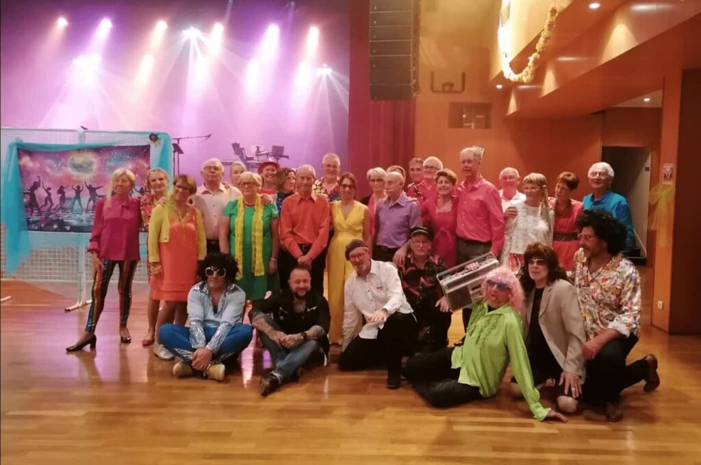 La joyeuse troupe de danseurs de notre Association qui a présenté, lors de notre diner dansant, une chorégraphie sur des musiques discos.